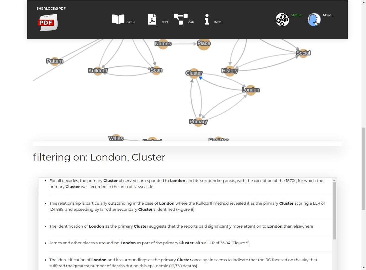 Sherlock helps directly by showing a small window of the keywords in a document; using graph theory it can also provide a window on very large graphs that can occur when many maps are overlaid.
